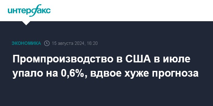 Промпроизводство в США в июле упало на 0,6%, вдвое хуже прогноза