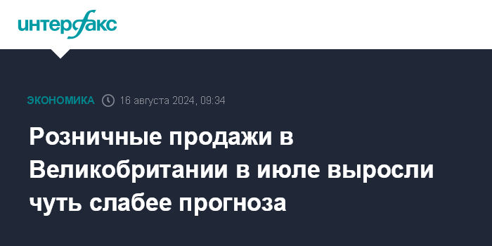 Москва. 16 августа. INTERFAX.RU - Розничные продажи в Великобритании в июле выросли на 0,5% относительно предыдущего месяца, говорится в отчете Национального статистического управления (ONS).