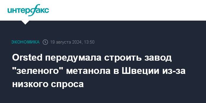 Москва. 19 августа. INTERFAX.RU - Датская энергетическая компания Orsted отказалась от строительства завода по выпуску е-метанола (продукт химического процесса, основанного на использовании "зеленого" водорода и биогенного углерода) на севере Швеции из-за низкого спроса на рынке, говорится в полугодовом отчете компании.