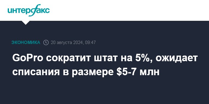 GoPro ожидает зафиксировать списание в размере $5-7 млн в связи с увольнениями, в том числе $1 млн в третьем квартале и $4-6 млн во втором квартале.