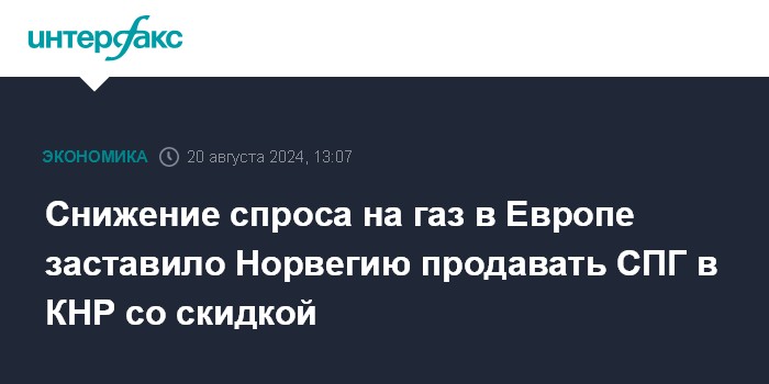 Москва. 20 августа. INTERFAX.RU - Целенаправленное ограничение потребления природного газа в Европе заставило ближайшего к ней крупного производителя и союзника - Норвегию - искать для своей продукции новые, логистически неудобные рынки.
