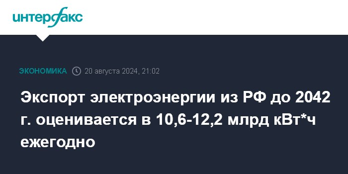 Экспорт электроэнергии из РФ до 2042 г. оценивается в 10,6-12,2 млрд кВт*ч ежегодно