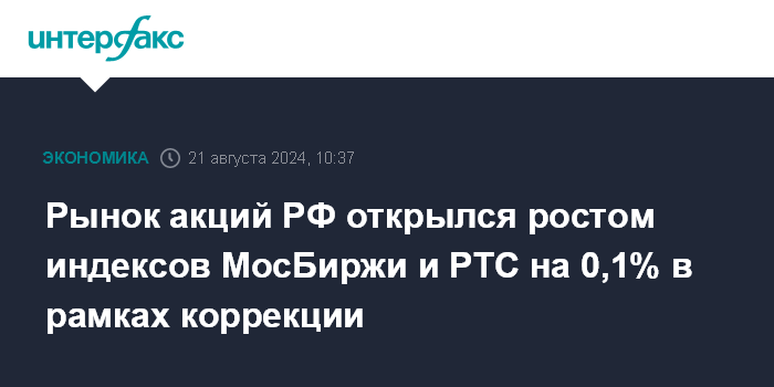 Москва. 21 августа. INTERFAX.RU - Рынок акций РФ на старте торгов среды демонстрирует плавный рост "голубых фишек" в рамках коррекции, рост обусловлен желанием ряда участников рынка частично прикрыть "короткие" позиции после пятидневного снижения; индексы МосБиржи и РТС за минуту торгов выросли на 0,14%.