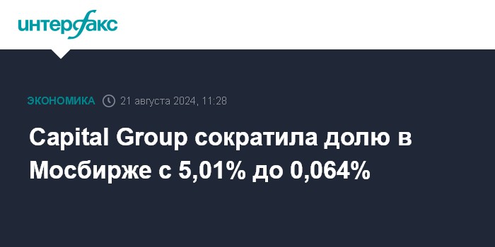 Москва. 21 августа. INTERFAX.RU - Американская Capital Group Companies сократила долю в "Московской бирже" с 5,01% до 0,064%.