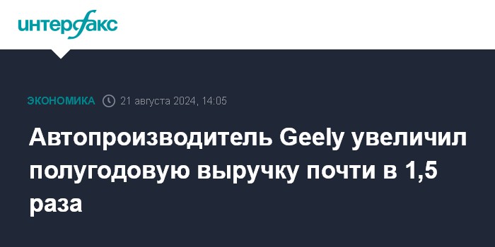 Москва. 21 августа. INTERFAX.RU - Один из крупнейших китайских автопроизводителей Geely Automobile Holdings Ltd в первом полугодии 2024 года зафиксировал резкий рост чистой прибыли и выручки благодаря увеличению продаж электромобилей.