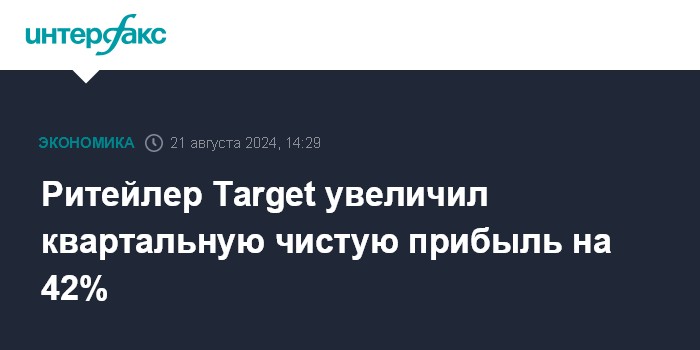 Москва. 21 августа. INTERFAX.RU - Target Corp., владелец одной из крупнейших в США сетей дисконтных магазинов, увеличил чистую прибыль во втором финансовом квартале на 42%, причем результат превзошел прогнозы рынка. Об этом говорится в пресс-релизе корпорации.