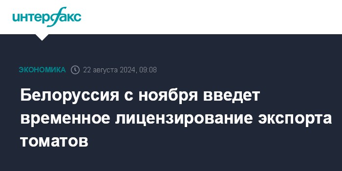 Москва. 22 августа. INTERFAX.RU - Правительство Белоруссии ввело лицензирование вывоза томатов из страны в целях продовольственной безопасности, такое постановление подписал премьер-министр республики Роман Головченко.