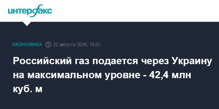 ""Газпром" осуществляет подачу российского газа для транзита через территорию Украины в объеме, подтвержденном украинской стороной через ГИС "Суджа", - 42,4 млн куб. м на 22 августа. Заявка на ГИС "Сохрановка" отклонена", - сообщил журналистам представитель "Газпрома" Сергей Куприянов.