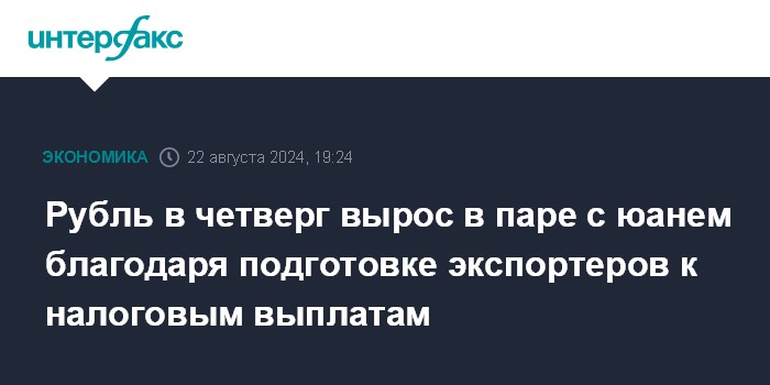 Москва. 22 августа. INTERFAX.RU - Китайский юань упал на Московской бирже по итогам торгов в четверг, рубль уверенно вырос в рамках подготовки компаний-экспортеров к налоговым выплатам на следующей неделе. Курс юаня в 19:00 по Москве составил 11,84 руб., что на 25 копеек ниже уровня закрытия предыдущих торгов. В последний раз рубль был на этих отметках 12 августа.