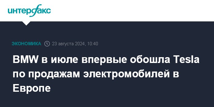 Москва. 23 августа. INTERFAX.RU - Германская Bayerische Motoren Werke AG (BMW) в июле впервые обошла Tesla Inc. по продажам электромобилей в Европе, став лидером этого рынка.