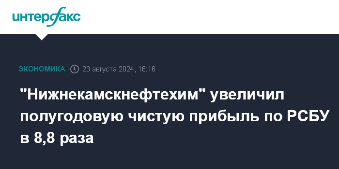 Москва. 23 августа. INTERFAX.RU - Чистая прибыль ПАО "Нижнекамскнефтехим" (НКНХ, входит в "СИБУР") по РСБУ в первом полугодии 2024 года составила 23,6 млрд рублей против 2,7 млрд рублей годом ранее, говорится в бухгалтерской отчетности компании. Таким образом, показатель увеличился в 8,8 раза.