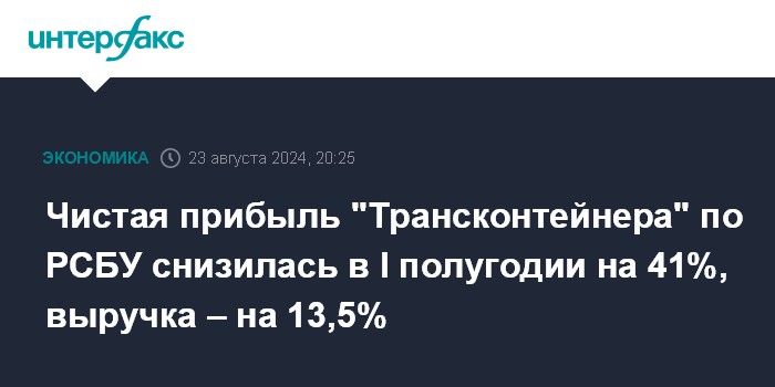 Москва. 23 августа. INTERFAX.RU - Чистая прибыль ПАО "Трансконтейнер" (входит в ГК "Дело") по РСБУ сократилась в I полугодии 2024 года на 41,3% к аналогичному периоду прошлого года и составила 6,97 млрд рублей, сказано в отчетности компании.