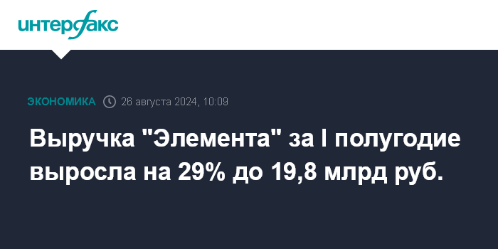 Москва. 26 августа. INTERFAX.RU - Выручка ПАО "Элемент" (головная структура группы компаний в сфере микроэлектроники, созданной на базе активов ПАО АФК "Система" и "Ростеха") по итогам I половины 2024 года составила 19,8 млрд рублей, что на 29% больше аналогичного показателя 2023 года, говорится в сообщении компании.