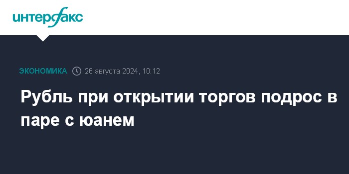 Москва. 26 августа. INTERFAX.RU - Китайский юань дешевеет на Московской бирже утром в понедельник. Рубль укрепляется в рамках подготовки компаний-экспортеров к перечислению в бюджет налоговых выплат. Единый день уплаты налогов в этом месяце приходится на среду, 28 августа.