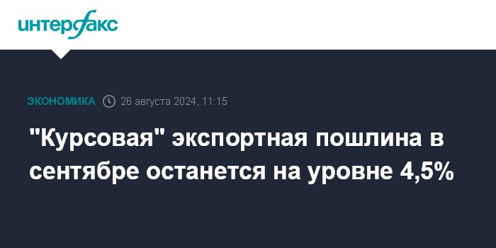 Москва. 26 августа. INTERFAX.RU - Привязанная к курсу доллара экспортная пошлина на широкую номенклатуру товаров с 1 по 30 сентября 2024 года останется на уровне 4,5%, говорится в сообщении Минэкономразвития РФ.