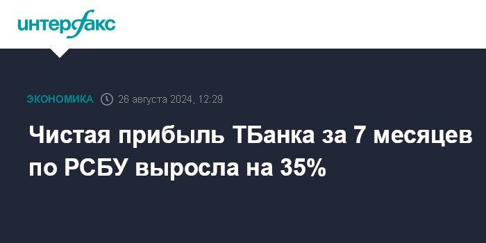 Москва. 26 августа. INTERFAX.RU - Чистая прибыль ТБанка за 7 месяцев 2024 года по РСБУ составила 33,24 млрд руб. против 24,61 млрд руб. за аналогичный период прошлого года. Об этом свидетельствуют расчеты на основе оборотной ведомости банка, опубликованной на сайте Банка России.