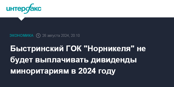 Быстринский ГОК "Норникеля" не будет выплачивать дивиденды миноритариям в 2024 году