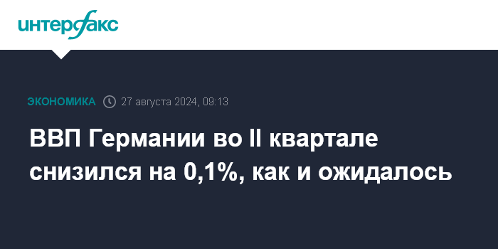 Москва. 27 августа. INTERFAX.RU - ВВП Германии во втором квартале 2024 года уменьшился на 0,1% к предыдущему кварталу, сообщило Федеральное статистическое агентство ФРГ Destatis, представив окончательные данные.