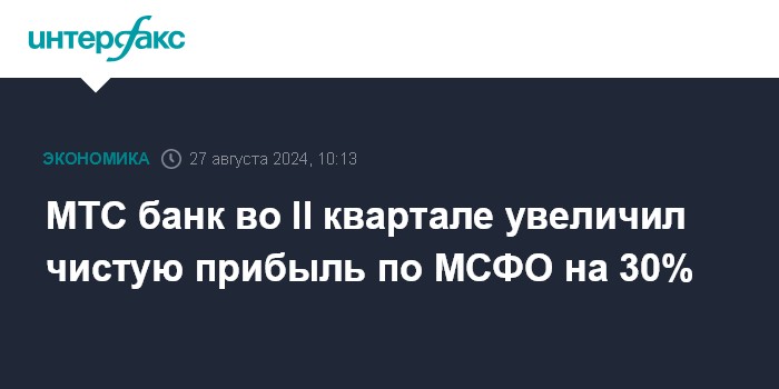 Москва. 27 августа. INTERFAX.RU - МТС банк во втором квартале 2024 года увеличил чистую прибыль по МСФО на 30% в годовом выражении, до 3,9 млрд рублей, сообщила пресс-служба кредитной организации.