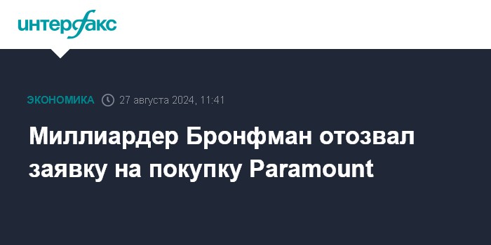 Отзыв заявки Бронфмана открывает путь к слиянию Paramount со Skydance Media, о согласовании которого стало известно в июле.