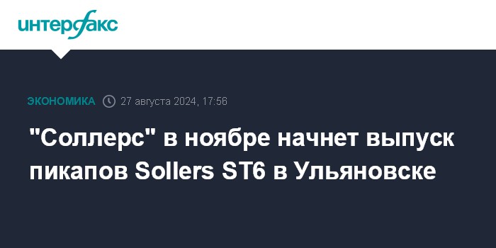 Москва. 27 августа. INTERFAX.RU - Российская автомобилестроительная группа "Соллерс" в ноябре начнет выпуск автомобилей Sollers ST6 на индустриальной площадке Ульяновского автозавода. Об этом сообщил губернатор Ульяновской области Алексей Русских в своем телеграм-канале.