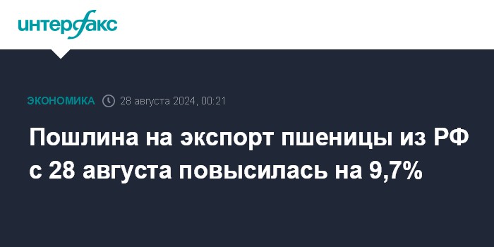 Пошлина на экспорт пшеницы из РФ с 28 августа повысилась на 9,7%