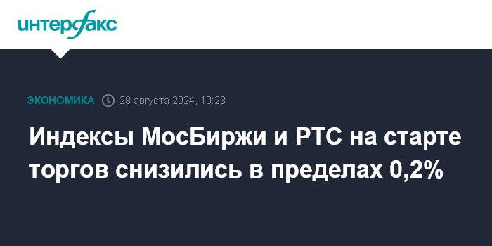 Москва. 28 августа. INTERFAX.RU - В среду в начале торгов российский рынок акций продолжил умеренное снижение на фоне ухудшения внешней фондовой и сырьевой конъюнктуры (подешевели металлы, Brent торгуется ниже $80 за баррель), индексы МосБиржи и РТС за минуту торгов просели на 0,1-0,2%.
