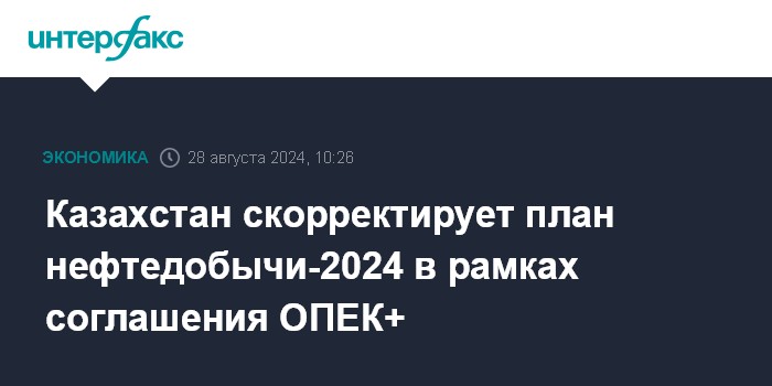 Москва. 28 августа. INTERFAX.RU - Казахстан готовит корректирующий план добычи нефти на 2024 год в связи с необходимостью выполнения обязательств в рамках соглашения ОПЕК+, сообщил "Интерфаксу" министр энергетики Алмасадам Саткалиев.