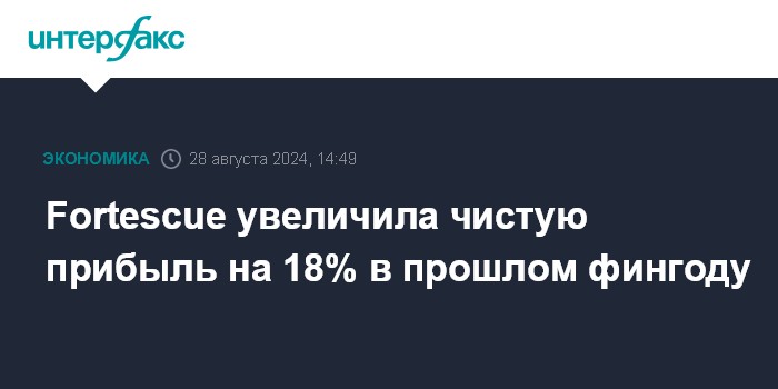Москва. 28 августа. INTERFAX.RU - Австралийская Fortescue, один из крупнейших производителей железной руды, увеличила по итогам финансового года (завершился 30 июня) чистую прибыль на 18% и повысила EBITDA на 7%, однако базовая прибыль оказалась хуже прогнозов рынка.