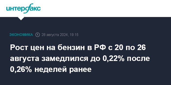 Рост цен на бензин в РФ с 20 по 26 августа замедлился до 0,22% после 0,26% неделей ранее
