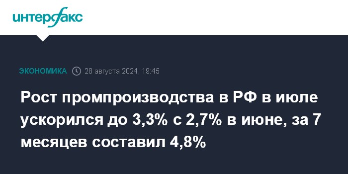Москва. 28 августа. INTERFAX.RU - Рост промпроизводства в РФ в июле 2024 года ускорился до 3,3% г/г после роста по уточненным данным на 2,7% в июне (вместо 1,9%), приводятся данные в докладе Росстата.