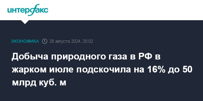 Добыча природного газа в РФ в жарком июле подскочила на 16% до 50 млрд куб. м