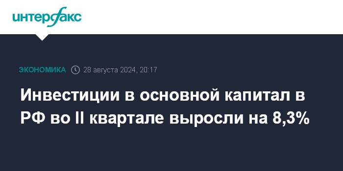 Москва. 28 августа. INTERFAX.RU - Инвестиции в основной капитал в РФ во II квартале 2024 года выросли на 8,3% по сравнению со II кварталом 2023 года, говорится в докладе Росстата.
