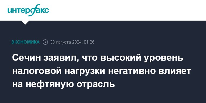 Москва. 30 августа. INTERFAX.RU - Продолжающийся рост налоговой нагрузки оказывает негативное влияние на нефтяную отрасль, считает главный исполнительный директор "Роснефти" Игорь Сечин.