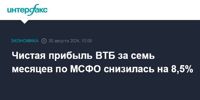 Чистая прибыль ВТБ за семь месяцев по МСФО снизилась на 8,5%