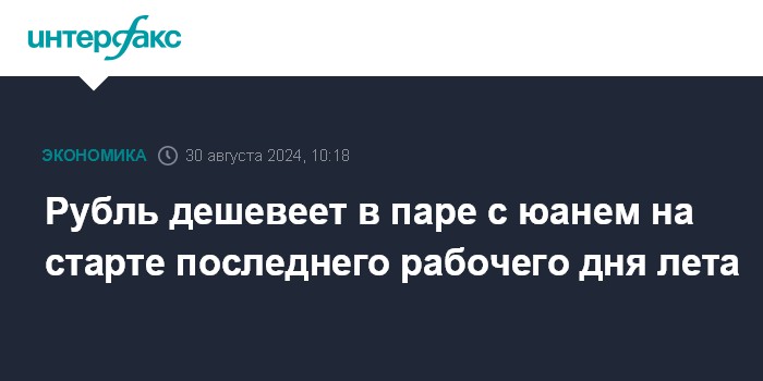 Москва. 30 августа. INTERFAX.RU - Китайский юань дорожает на Московской бирже утром в пятницу; рубль дешевеет в последний рабочий день лета и перед выходными днями.