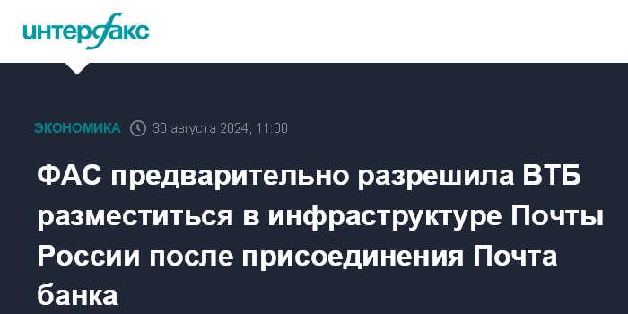 В середине августа глава ВТБ Андрей Костин сообщил, что ФАС согласовала запланированное на 2026 год присоединение Почта банка к ВТБ.