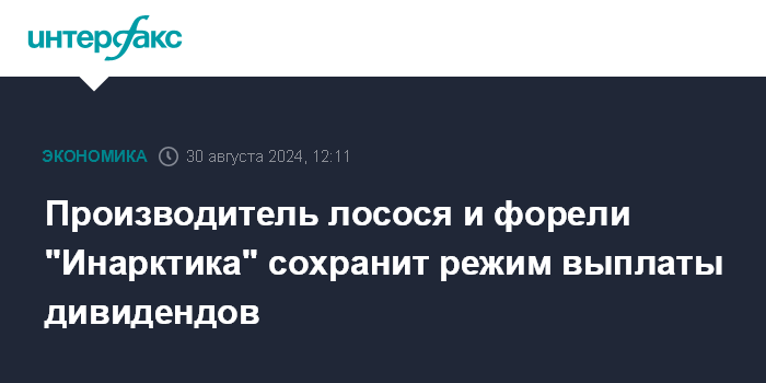 Москва. 30 августа. INTERFAX.RU - Компания "Инарктика", ведущий производитель атлантического лосося и форели в РФ, планирует сохранить действующий режим выплаты дивидендов - три раза в год, сообщил генеральный директор компании Илья Соснов на телефонной конференции в пятницу.