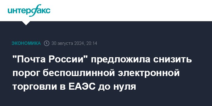 В "Почте России" подтвердили "Интерфаксу" подготовку таких предложений, отметив, что они сформированы с учетом решений и договоренностей, достигнутых на межведомственном совещании по вопросам проектируемого на площадке ЕЭК регулирования в отношении товаров трансграничной электронной торговли с участием представителей бизнес-сообщества.