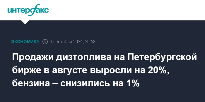 Дизельного топлива реализовано 1,58 млн тонн (рост на 20,3%). Из них 1,29 млн тонн - летнего ДТ (рост на 15,4%), зимнего - 134,3 тыс. тонн (рост на 8,4%), арктического - 123,9 тыс. тонн (рост в 1,8 раза), межсезонного - 30 тыс. тонн (против 2 тыс. тонн в августе-23).