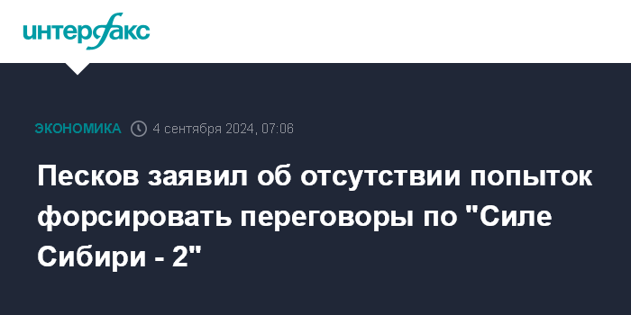Москва. 4 сентября. INTERFAX.RU - Никто не пытается форсировать переговоры о заключении контрактов на поставки газа по трубопроводу "Сила Сибири - 2", заявили в Кремле.