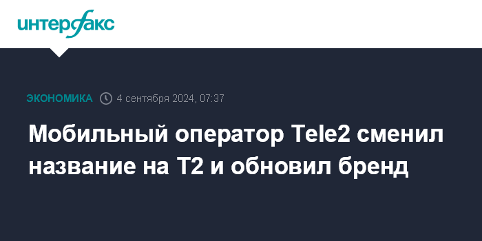 Москва. 4 сентября. INTERFAX.RU - Оператор мобильной связи Tele2 (ООО "Т2 Мобайл") изменил название на T2 и провел ребрендинг, говорится в сообщении компании.