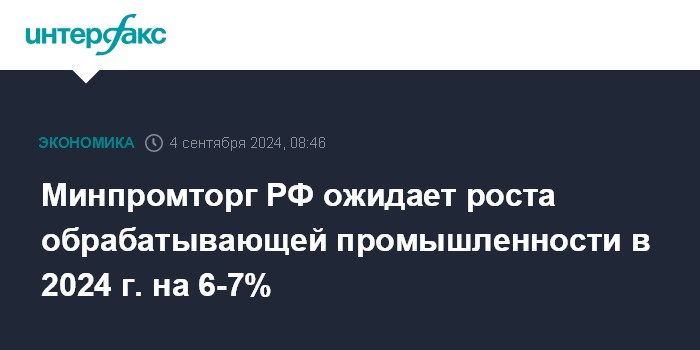 Минпромторг РФ ожидает роста обрабатывающей промышленности в 2024 г. на 6-7%