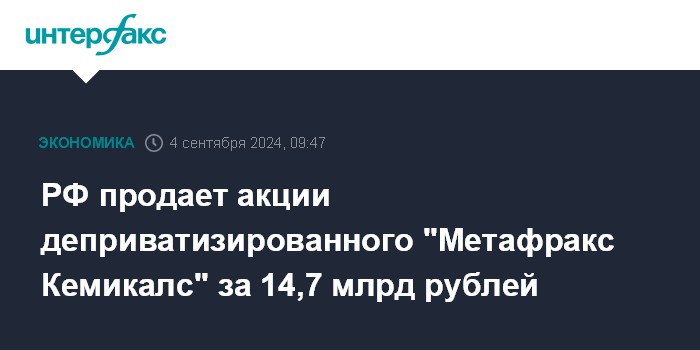 РФ продает акции деприватизированного "Метафракс Кемикалс" за 14,7 млрд рублей
