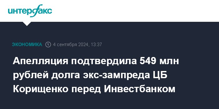 Апелляция подтвердила 549 млн рублей долга экс-зампреда ЦБ Корищенко перед Инвестбанком
