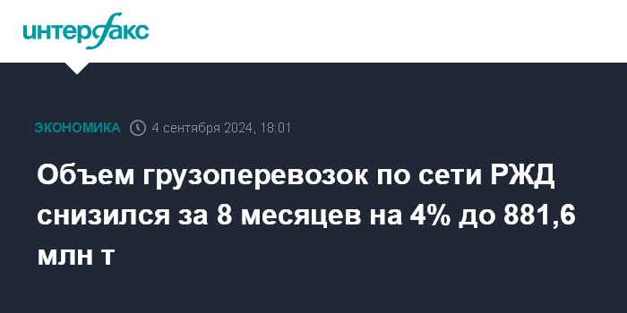 Москва. 4 сентября. INTERFAX.RU - Объем перевозок грузов по сети ОАО "Российские железные дороги" (РЖД) уменьшился в январе-августе 2024 года по сравнению с тем же периодом прошлого года на 4% до 881,6 млн тонн, сообщается в материалах компании, с которыми ознакомился "Интерфакс".