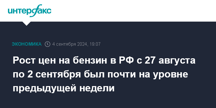 Рост цен на бензин в РФ с 27 августа по 2 сентября был почти на уровне предыдущей недели