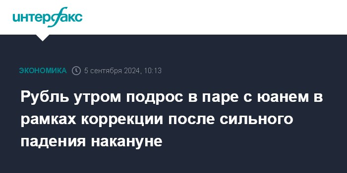 Москва. 5 сентября. INTERFAX.RU - Китайский юань дешевеет на Московской бирже утром в четверг, рубль корректируется вверх после сильного падения по итогам предыдущих торгов.