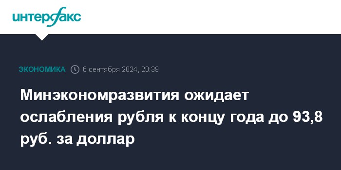 К концу 2024 года Минэкономразвития закладывает в прогноз курс на уровне 93,8 руб. за доллар, к концу 2025 года - 98,1 руб., к концу 2026 года - 101,1 руб., к концу 2027 года - 105 руб.