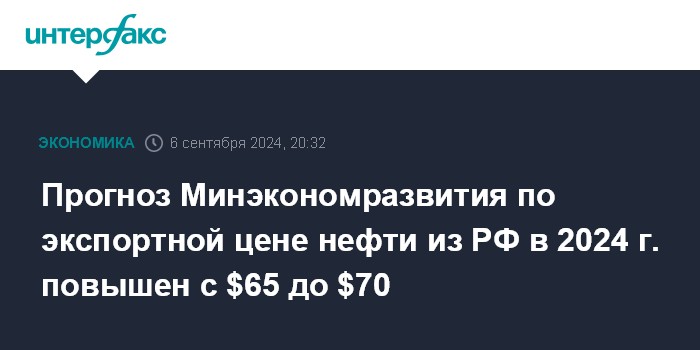 Москва. 6 сентября. INTERFAX.RU - Минэкономразвития повысило прогноз по стоимости российской нефти при поставках на экспорт в 2024 году до $70 за баррель с $65 в апрельской версии прогноза, сообщил журналистам представитель Минэкономразвития.